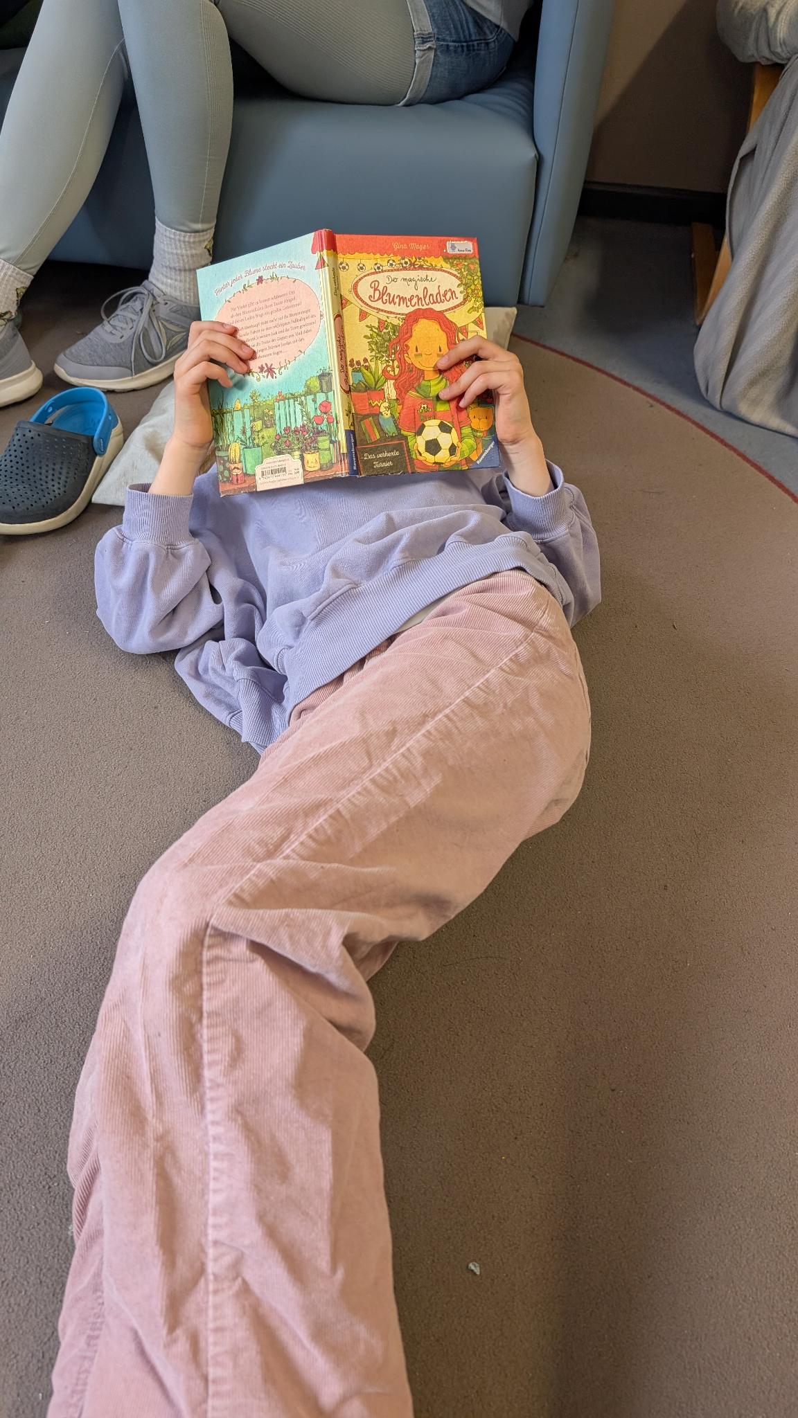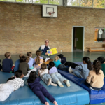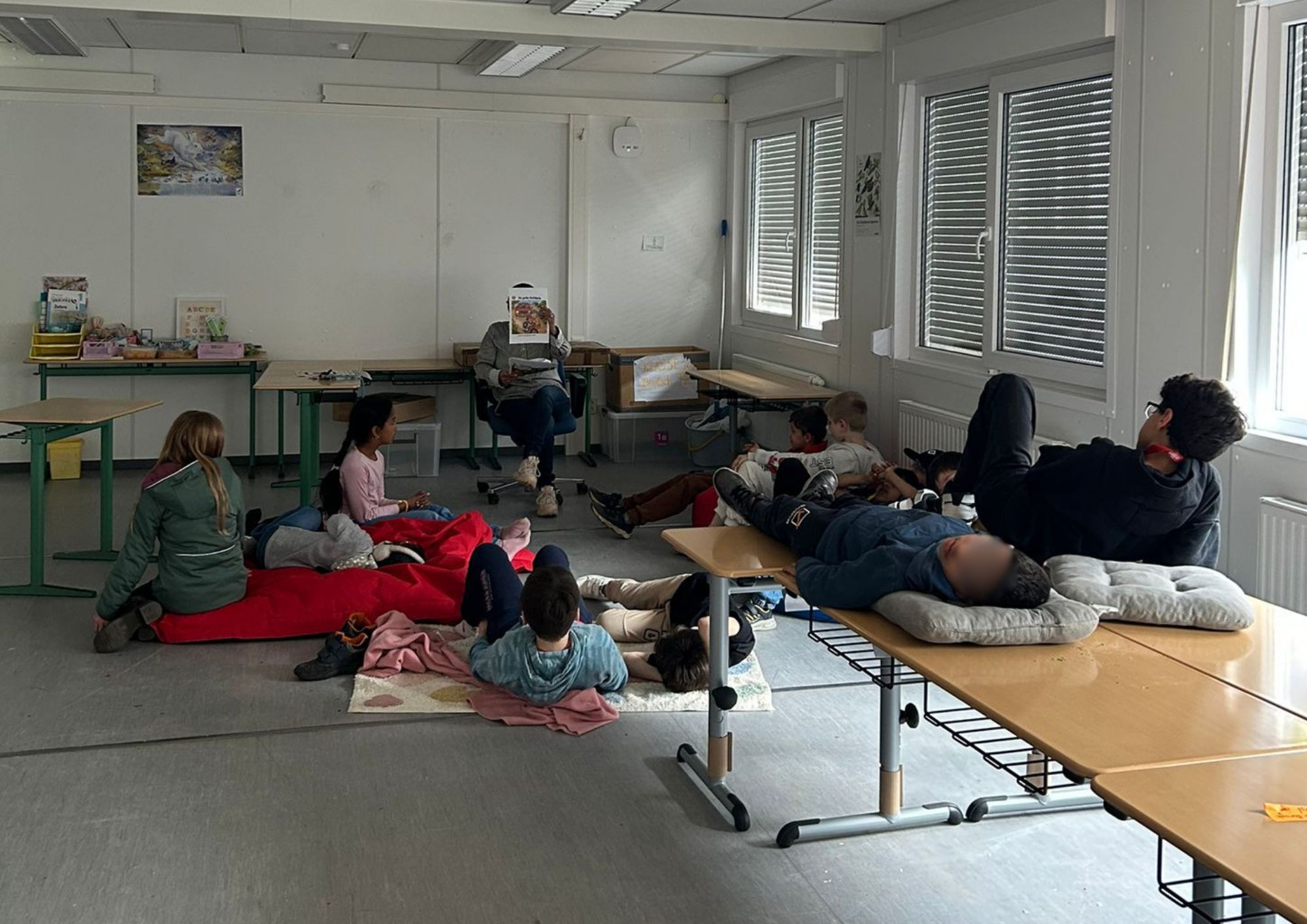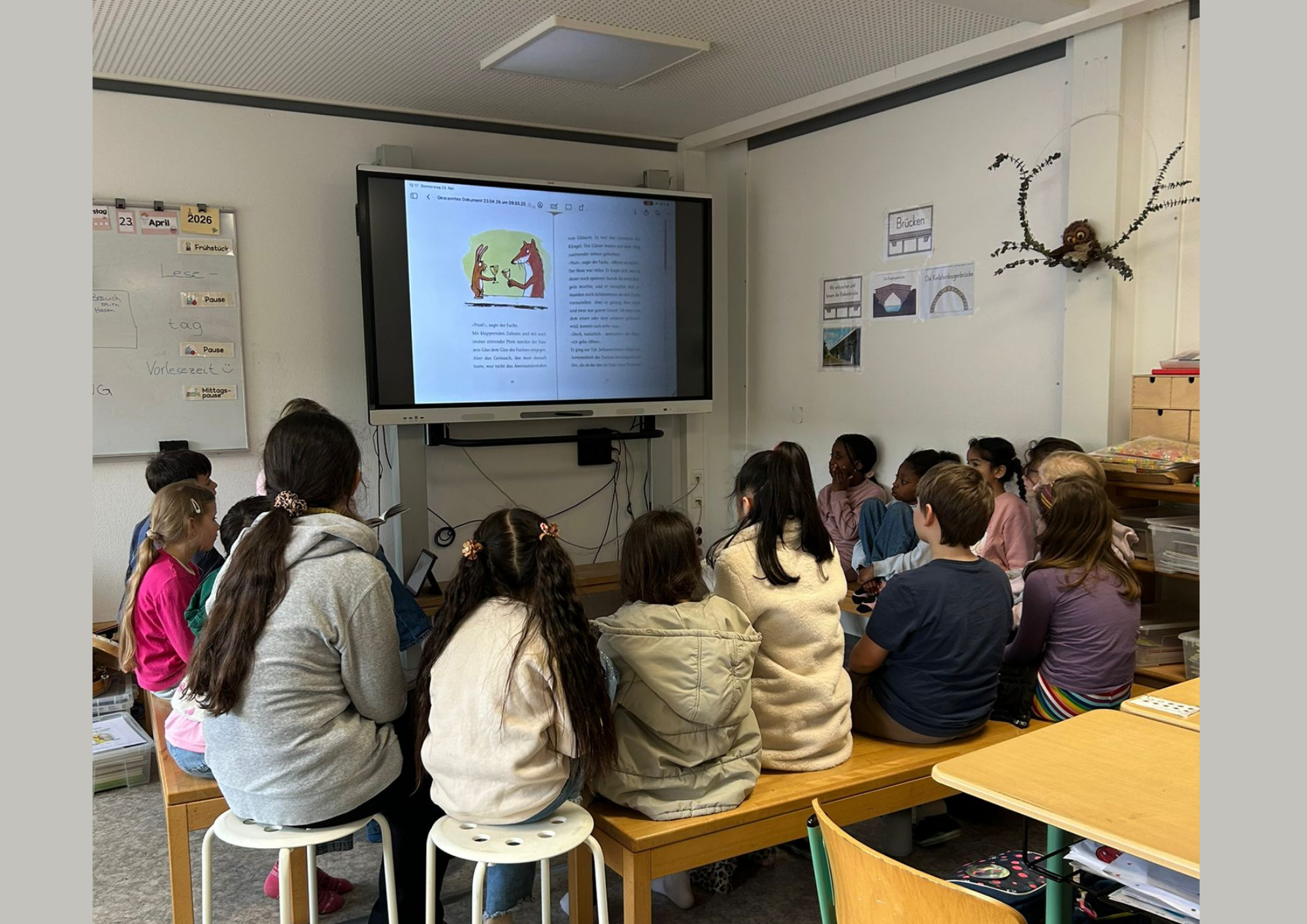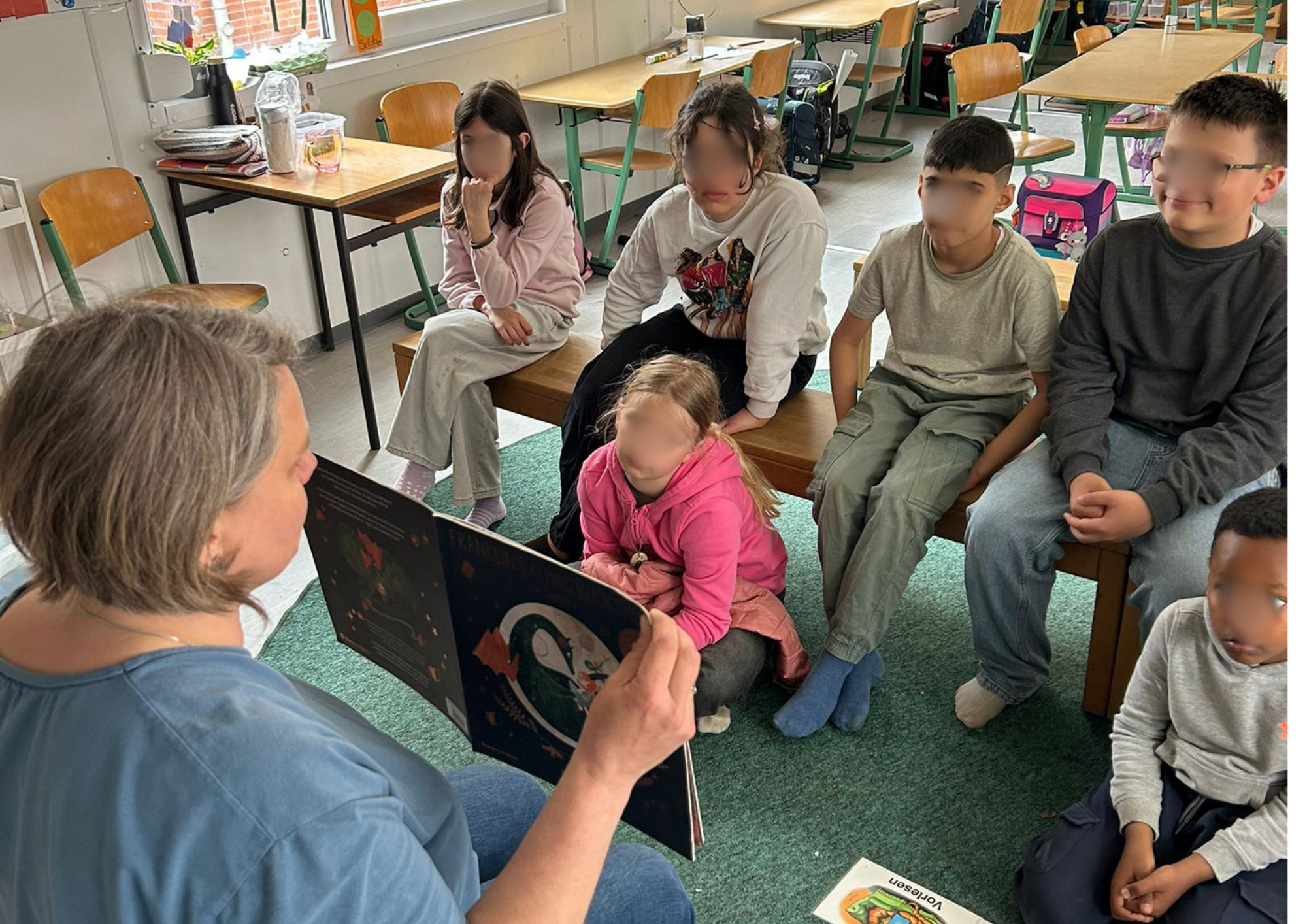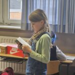 Ein besonderes Highlight bildete die letzte Stunde des Tages: das Vorlesen. Alle Erwachsenen der Schule hatten im Vorfeld ein Buch ausgewählt und dieses auf einem Plakat vorgestellt. Die Kinder konnten sich die Präsentationen anschauen und anschließend selbst entscheiden, welchem Buch sie lauschen möchten. Mit großer Neugier und Vorfreude suchten sie sich ihr Wunschangebot aus und machten es sich in gemütlicher Atmosphäre zum Zuhören bequem.