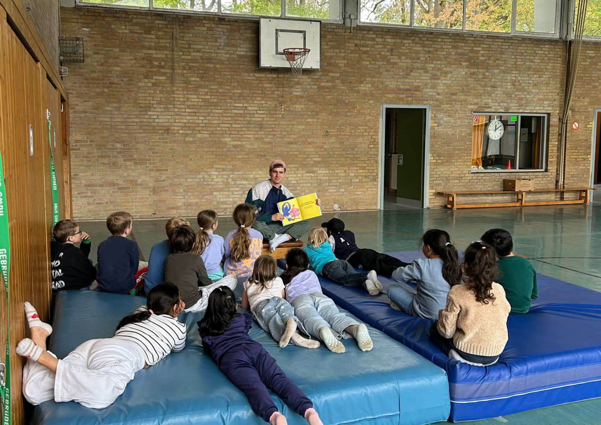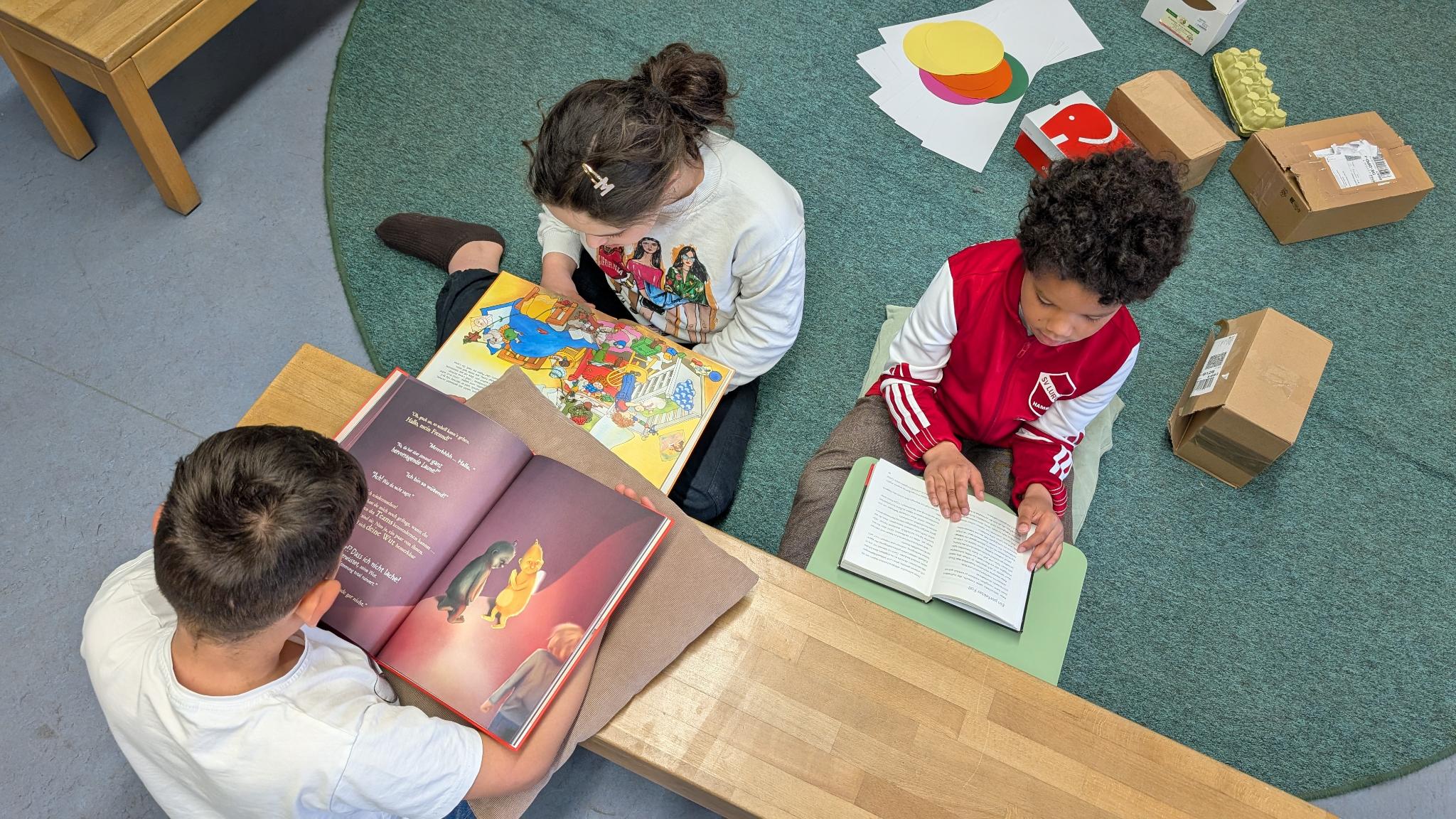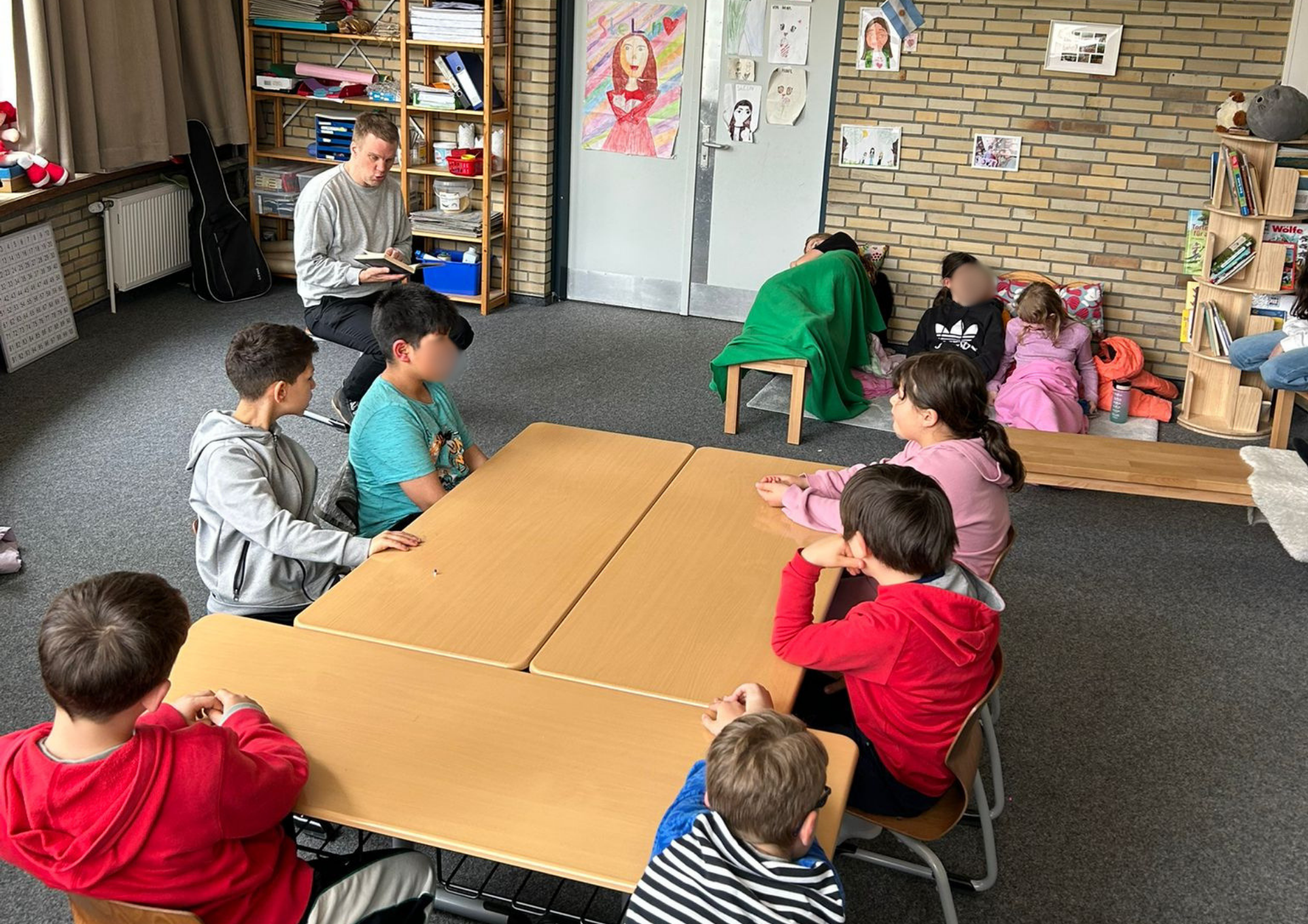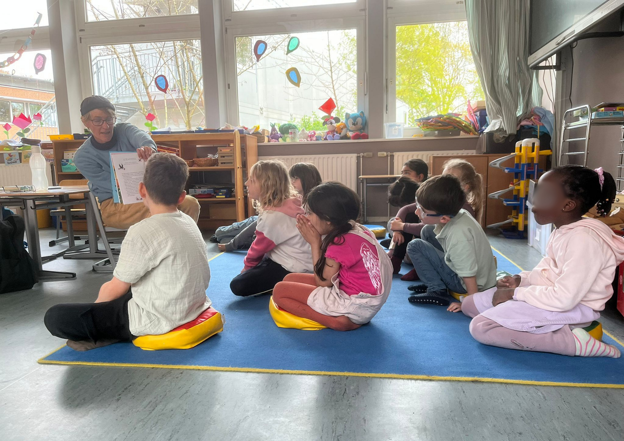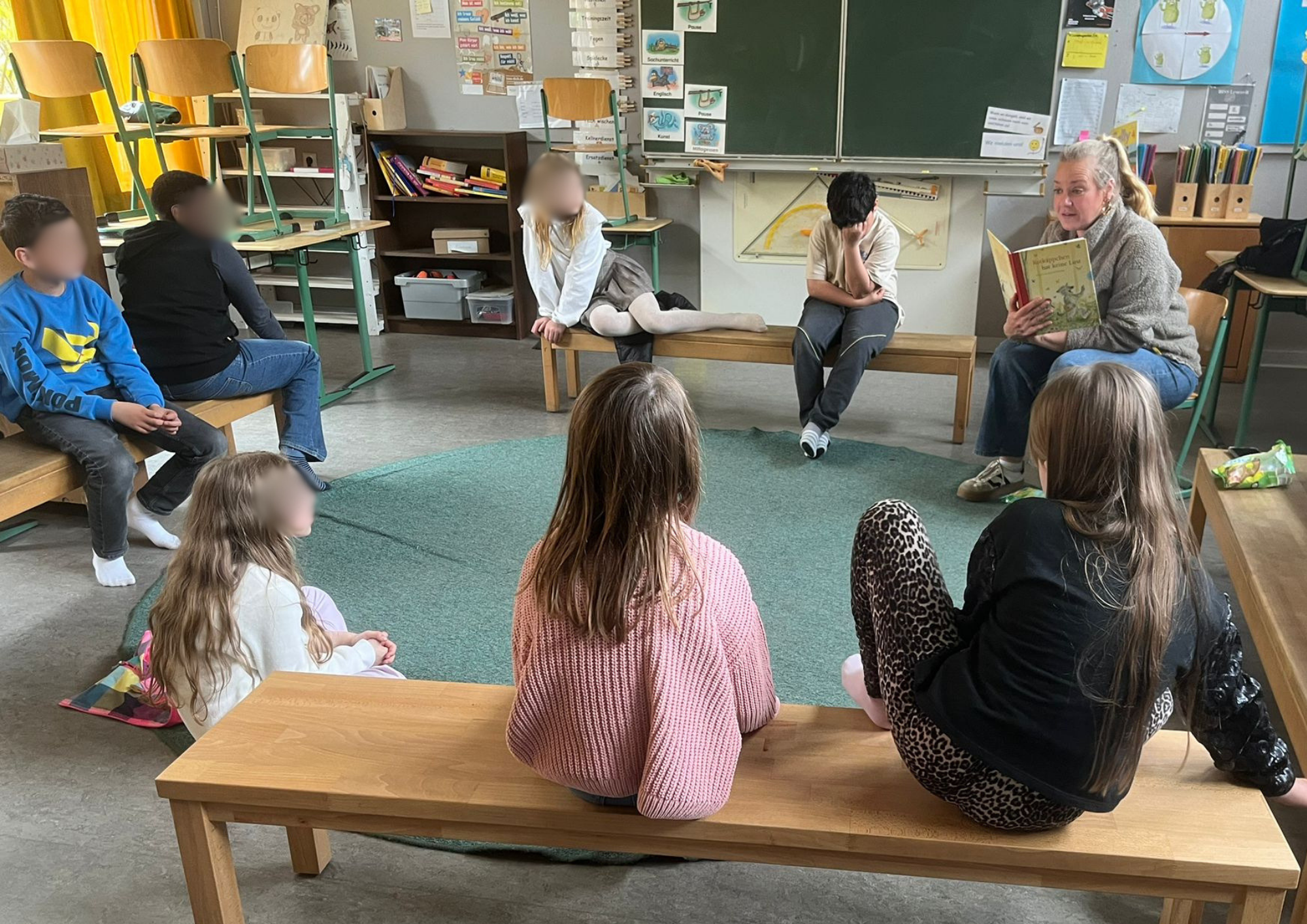 Ein besonderes Highlight bildete die letzte Stunde des Tages: das Vorlesen. Alle Erwachsenen der Schule hatten im Vorfeld ein Buch ausgewählt und dieses auf einem Plakat vorgestellt. Die Kinder konnten sich die Präsentationen anschauen und anschließend selbst entscheiden, welchem Buch sie lauschen möchten. Mit großer Neugier und Vorfreude suchten sie sich ihr Wunschangebot aus und machten es sich in gemütlicher Atmosphäre zum Zuhören bequem.