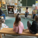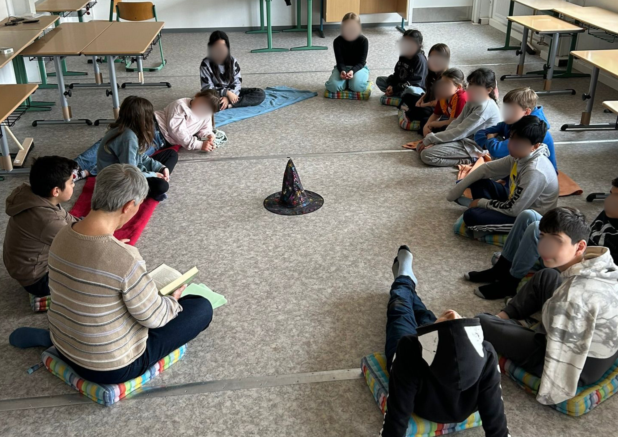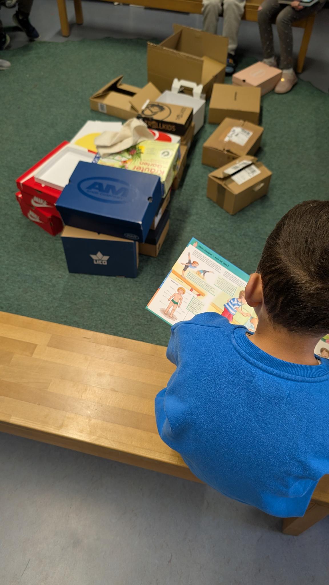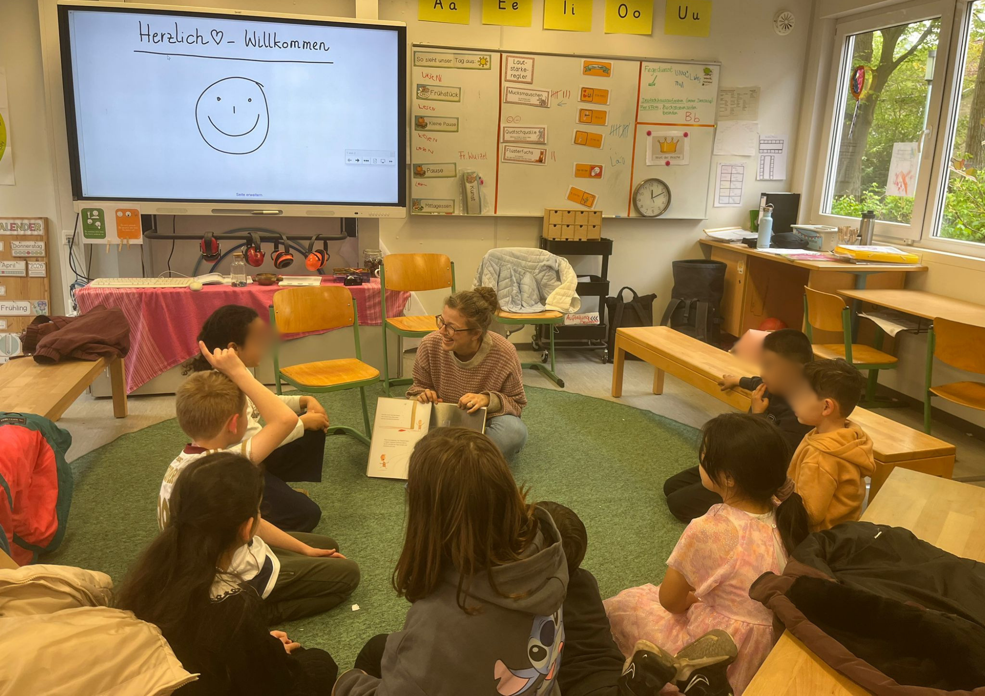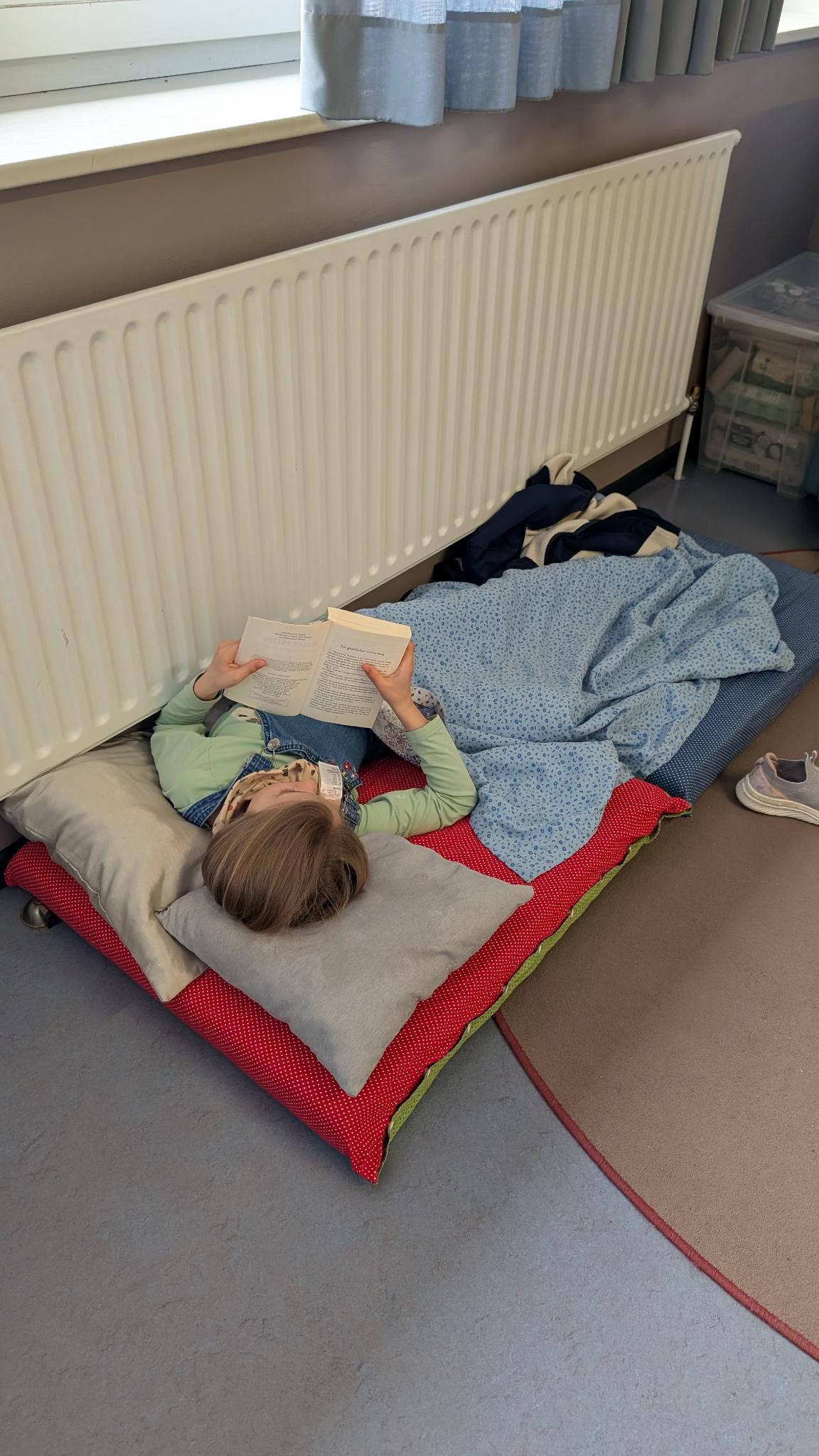 Ein besonderes Highlight bildete die letzte Stunde des Tages: das Vorlesen. Alle Erwachsenen der Schule hatten im Vorfeld ein Buch ausgewählt und dieses auf einem Plakat vorgestellt. Die Kinder konnten sich die Präsentationen anschauen und anschließend selbst entscheiden, welchem Buch sie lauschen möchten. Mit großer Neugier und Vorfreude suchten sie sich ihr Wunschangebot aus und machten es sich in gemütlicher Atmosphäre zum Zuhören bequem.