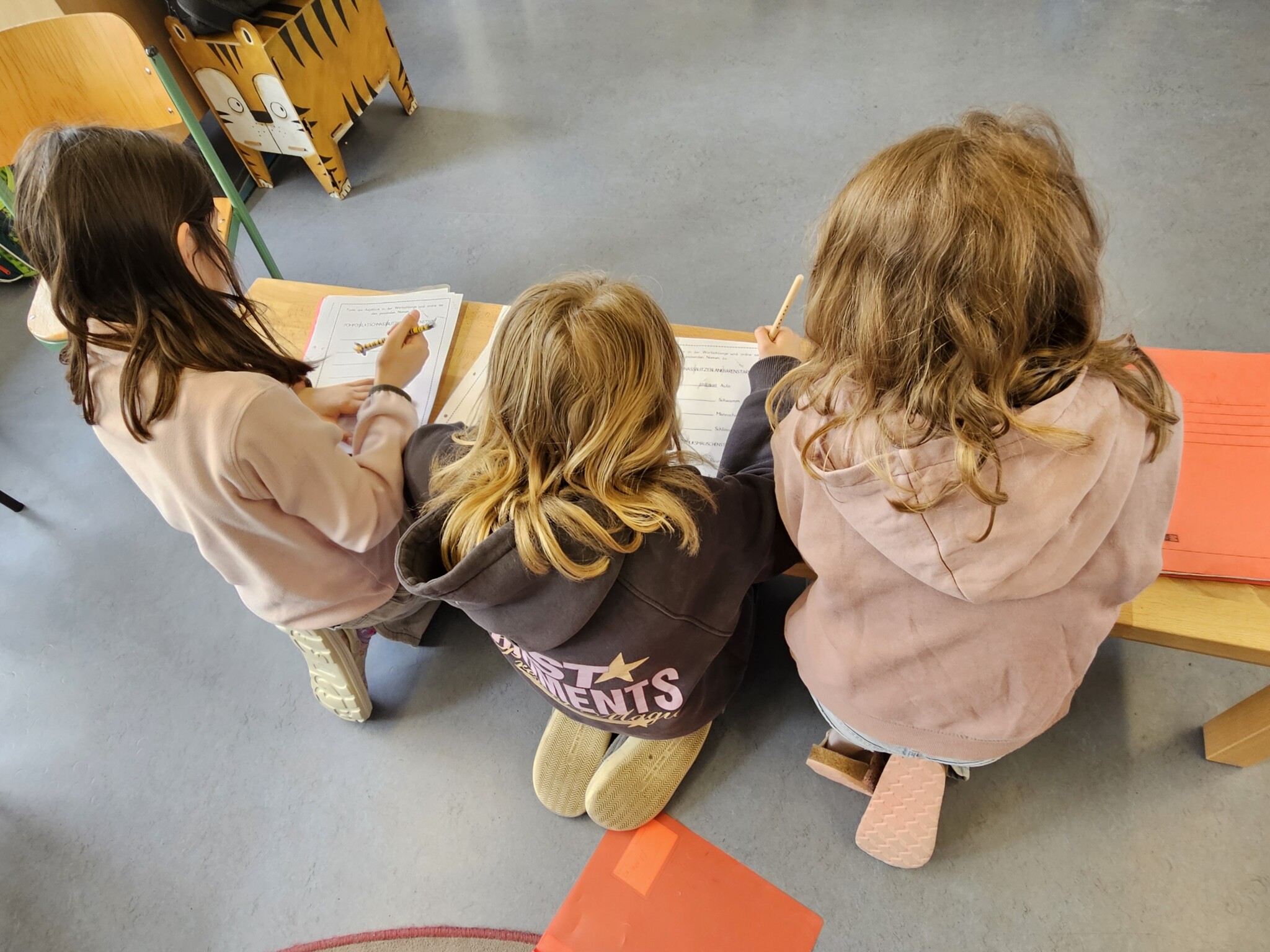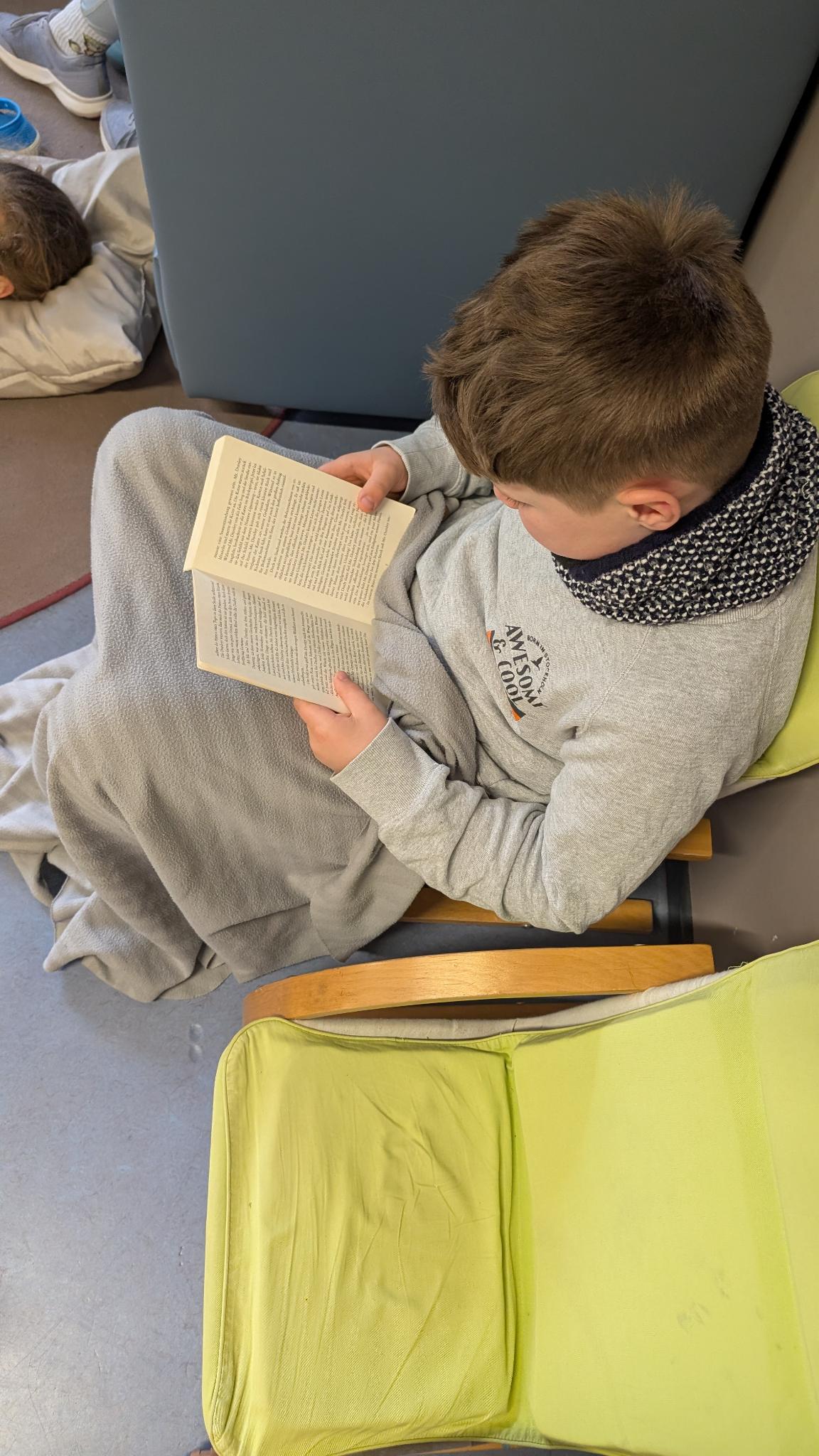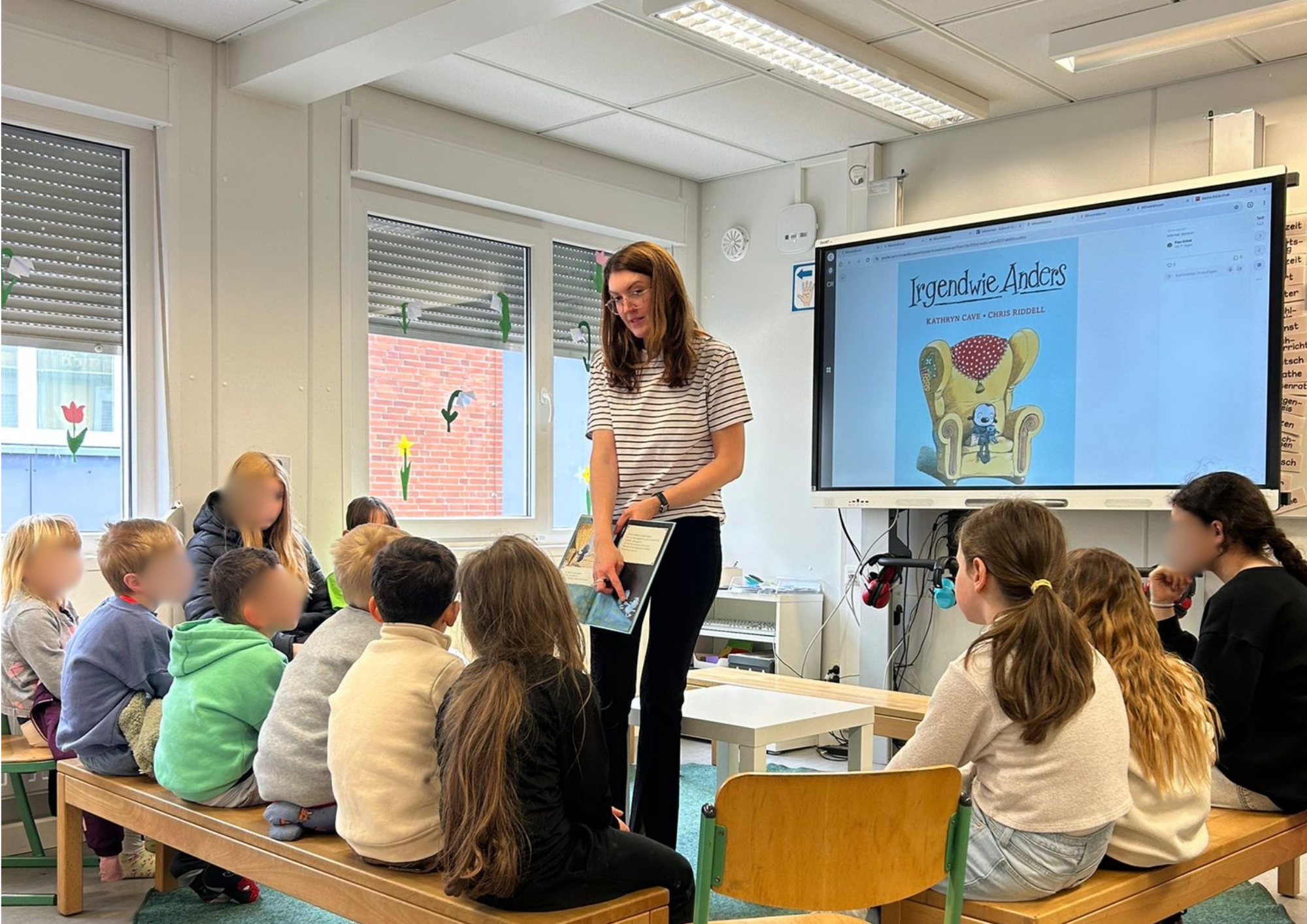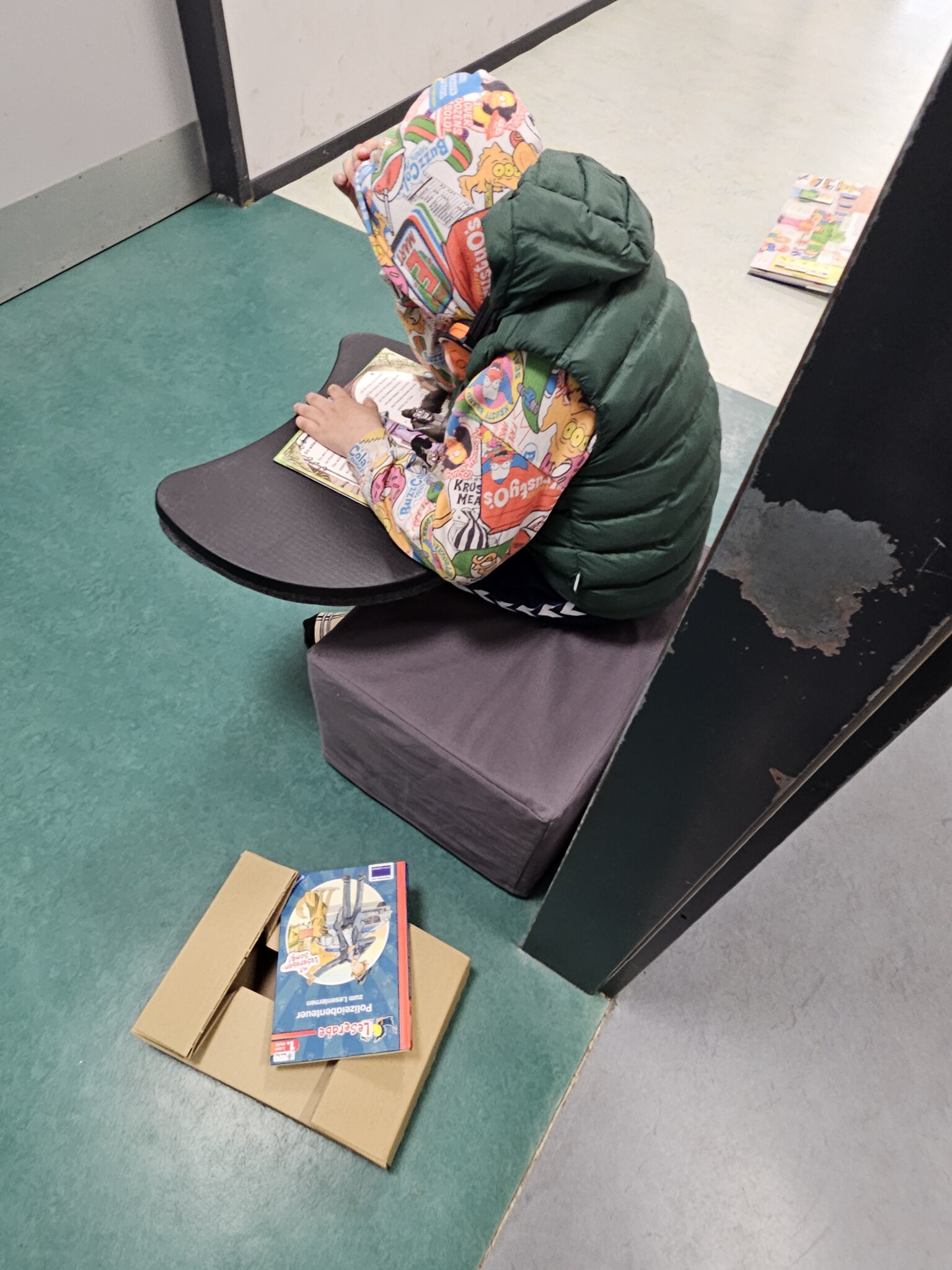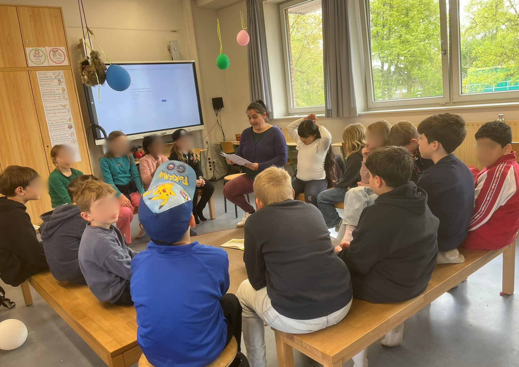 Ein besonderes Highlight bildete die letzte Stunde des Tages: das Vorlesen. Alle Erwachsenen der Schule hatten im Vorfeld ein Buch ausgewählt und dieses auf einem Plakat vorgestellt. Die Kinder konnten sich die Präsentationen anschauen und anschließend selbst entscheiden, welchem Buch sie lauschen möchten. Mit großer Neugier und Vorfreude suchten sie sich ihr Wunschangebot aus und machten es sich in gemütlicher Atmosphäre zum Zuhören bequem.