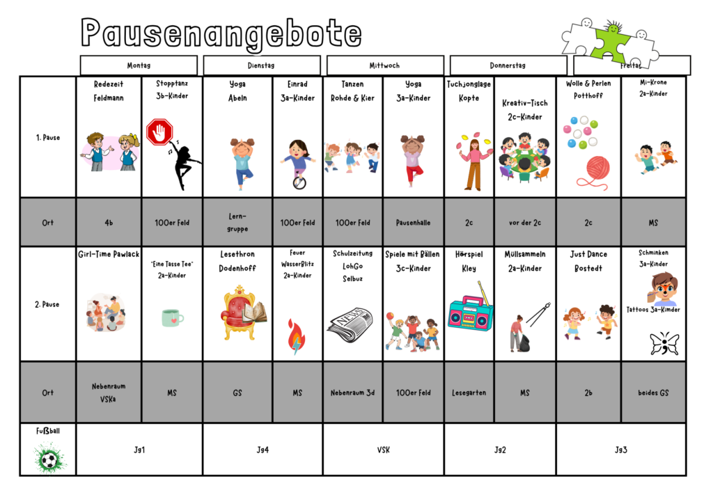 Wir starten im Schuljahr 2025/26 wieder mit unseren Pausenangeboten. Ihr findet hier die Angebote verschiedener Lehrkräfte und verschiedener Kinder unserer Schule.